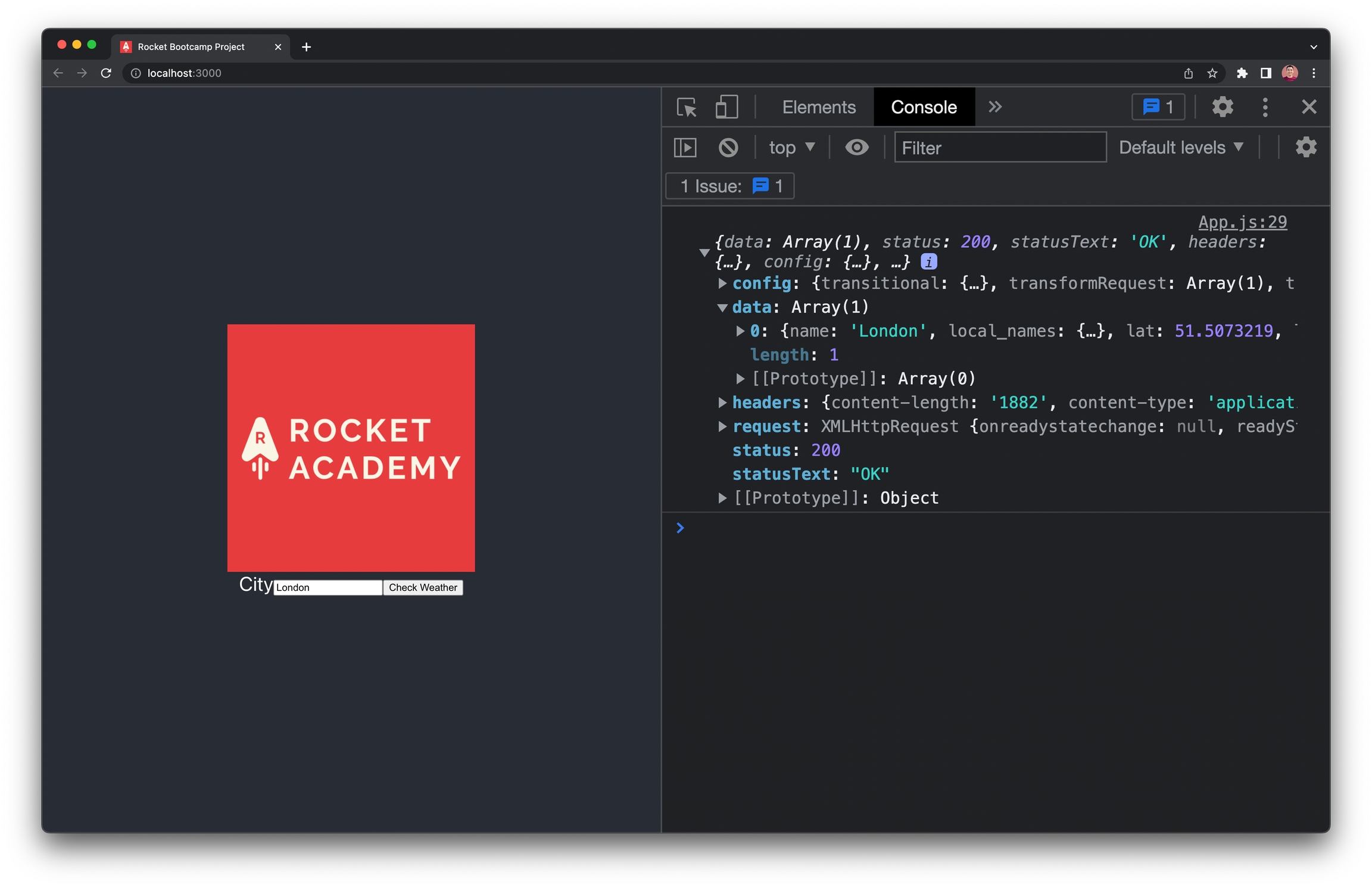 API responses to understand the format of the response before writing code logic. See below code example for an illustration.We will need to use Open Weather's geocoding API to translate location names to coordinates before querying the current weather data API. You may find it helpful to chain promises with