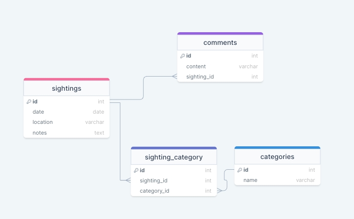 Instead of depicting M-M relationships with lines that have crow's feet at both ends, a common practice in ERDs is to split M-M relationships into 2 1-M relationships, like what we did with Sightings