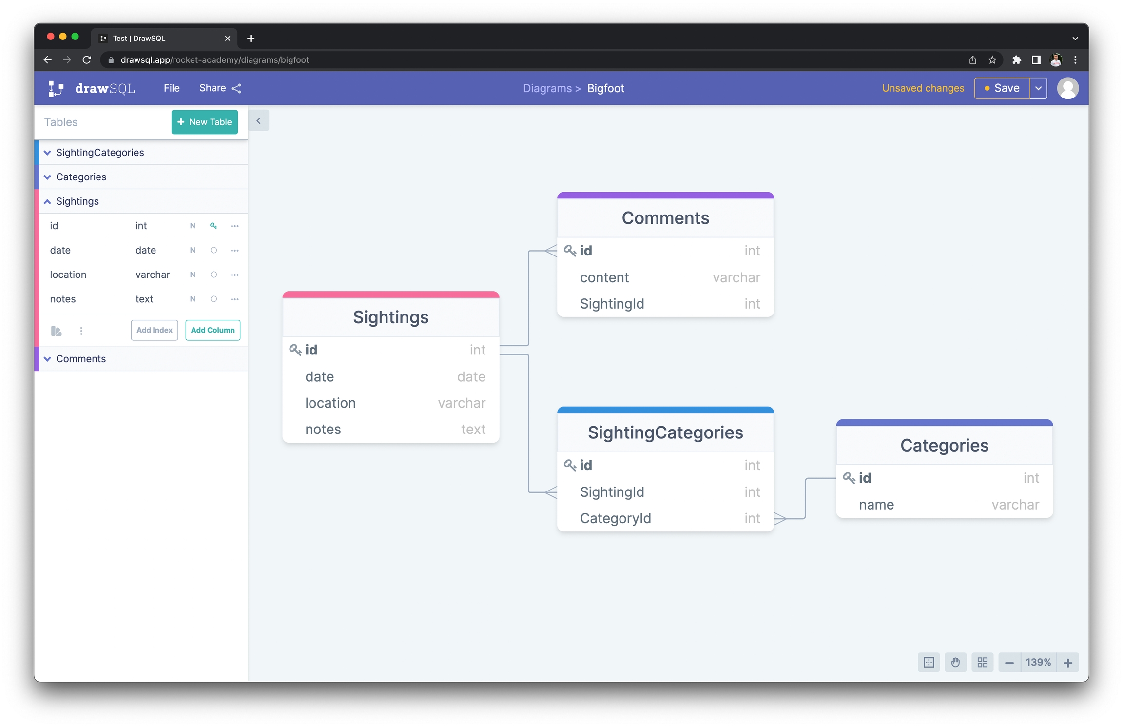 Below is a sample ERD for Rocket's Bigfoot exercises created with DrawSQL.