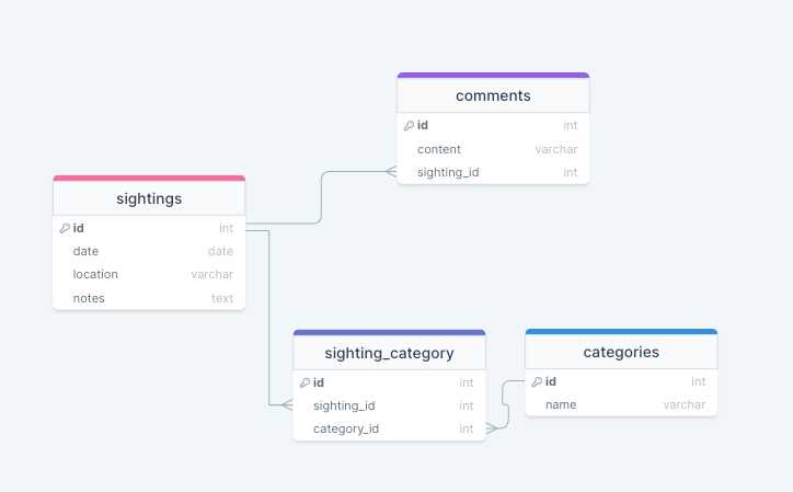 Notice the 3 entities we created for our app: sightings, comments and categories in their respective tables. Notice there is a 4th table SightingCategories between Sightings and Categories; This is the junction table in the M-M relationship. We will always include junction tables in our ERDs even if we do not create models for them in our apps.
