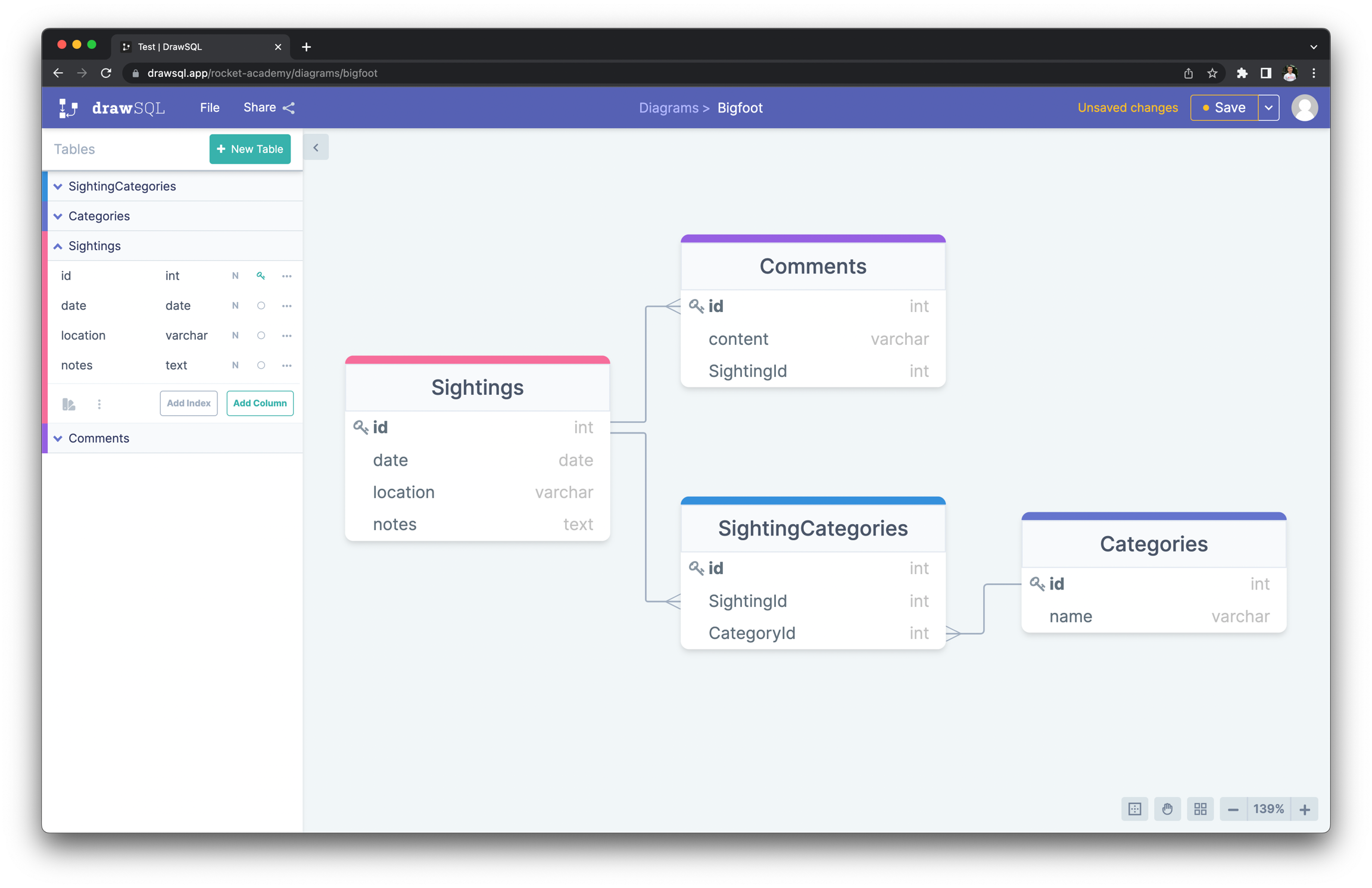 Below is a sample ERD for Rocket's Bigfoot exercises created with DrawSQL.