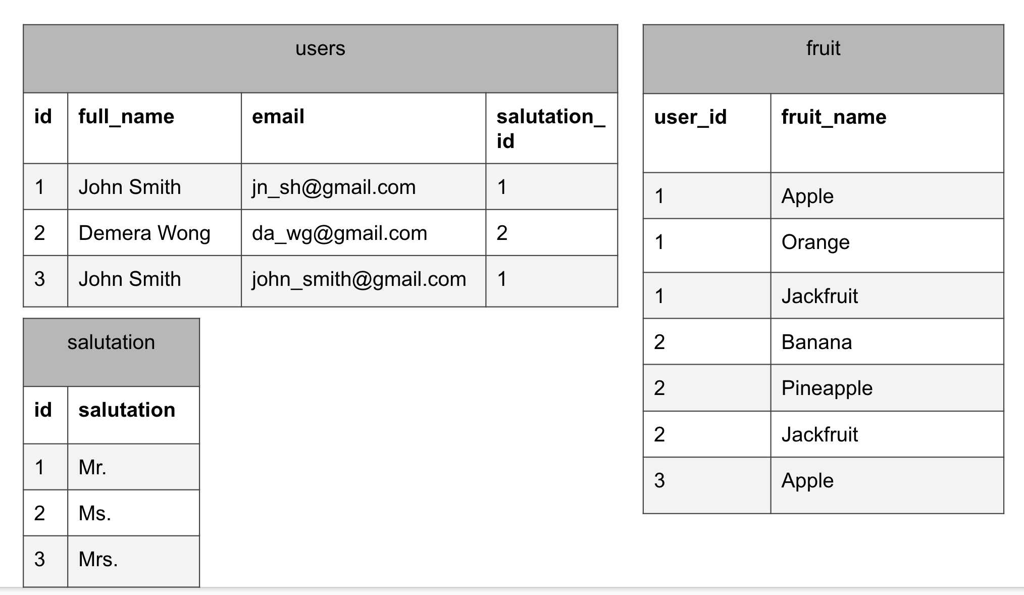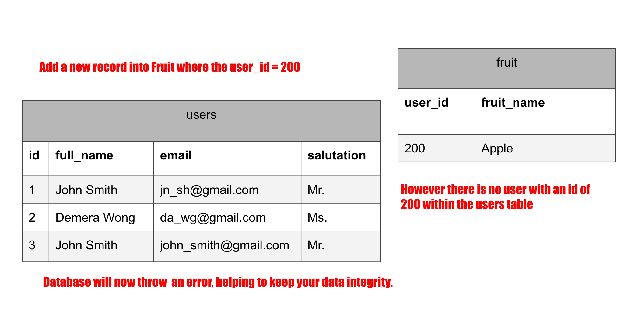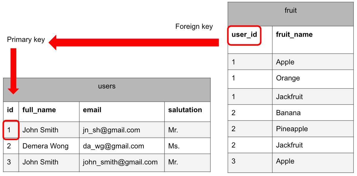 Primary and Foreign keys help us to define the relationships between our table, in this case, a 1-many relationship, a user can have multiple fruit. Without this relationship defined data integrity could not be handed by SQL.