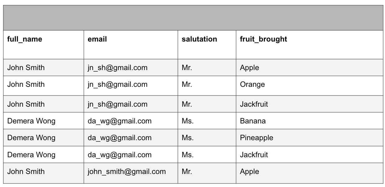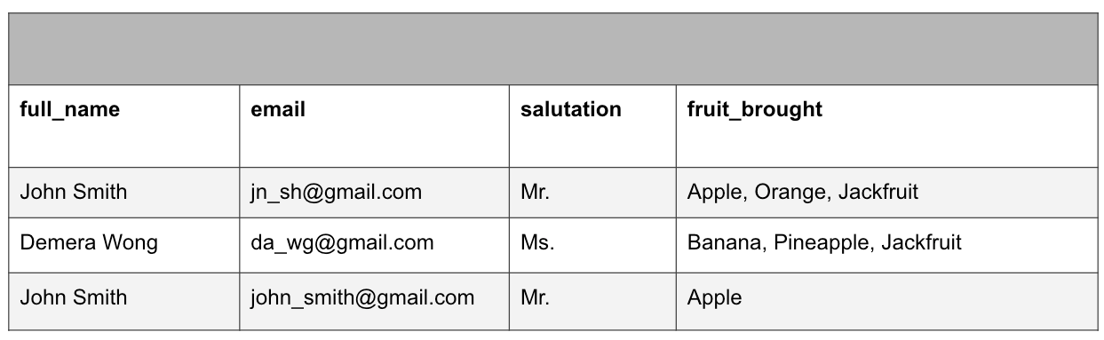 As you can see from the table above there is an issue with the column fruit_brought, there are multiple items listed per cell, some repeating multiple times, we will need to alter our database to represent the data more efficiently for querying.