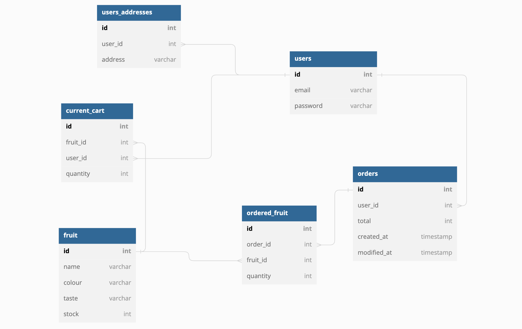 As user will be able to send their orders to various addresses we will need to store multiple user addresses, this means we will need to create a users_addresses table that contains each address that the user could send their fruit order to.