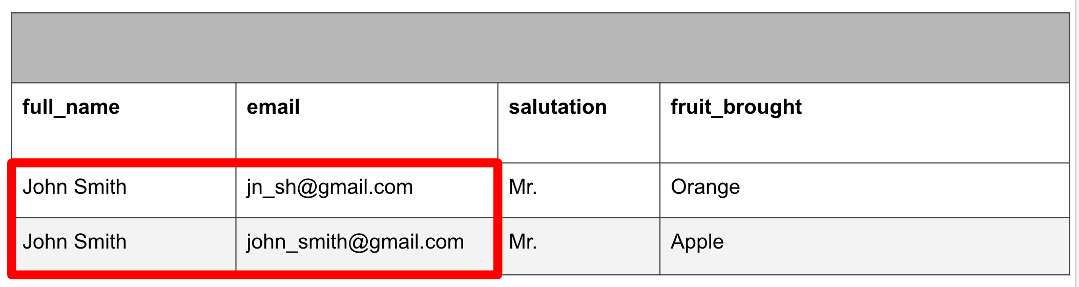 Currently we are using composite keys to identify rows of data in the table above, full_name could be repeated, so we would actually reference the name and email to identify the user.