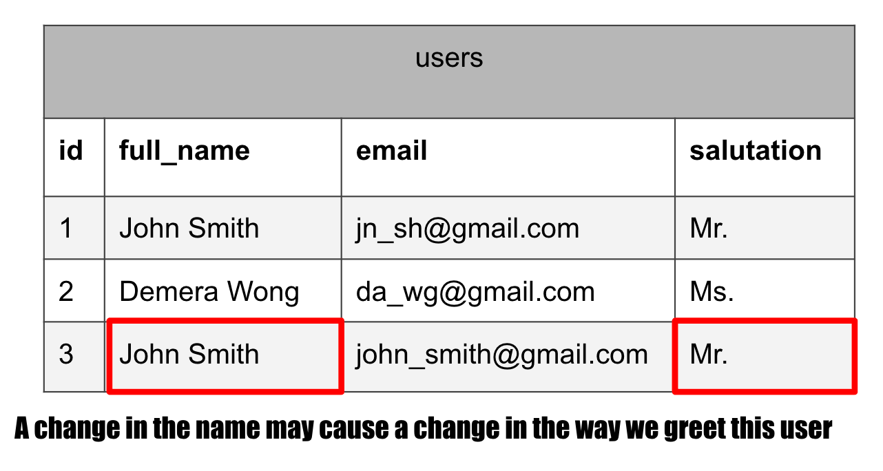 If a full name changes this might alter a salutation, and therefore we shouldn’t have this relationship within our schema. We will need to break the Salutation into another table that we can reference.