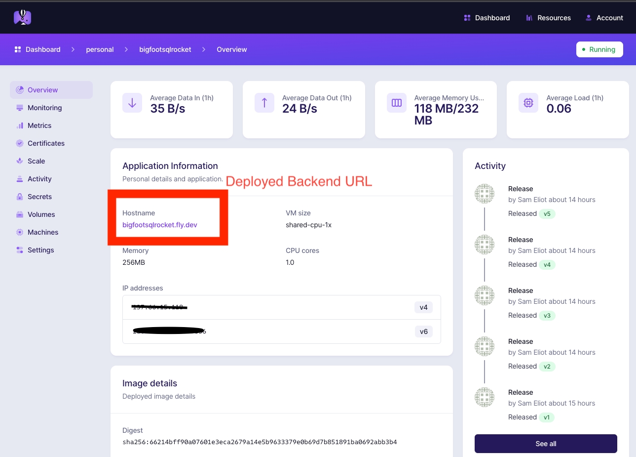 You can find the deployed backend url on your fly.io dashboard as seen in the images below.