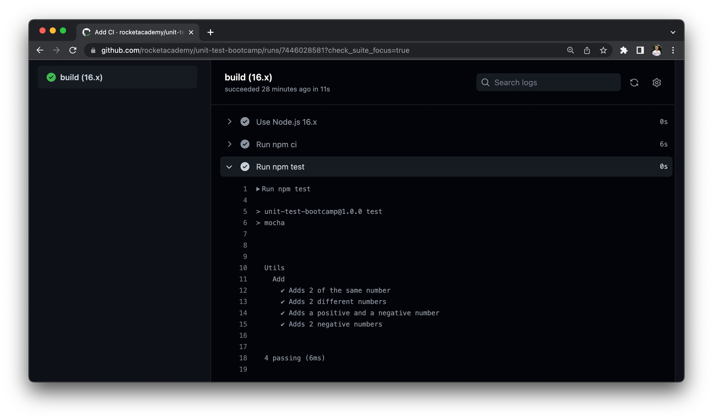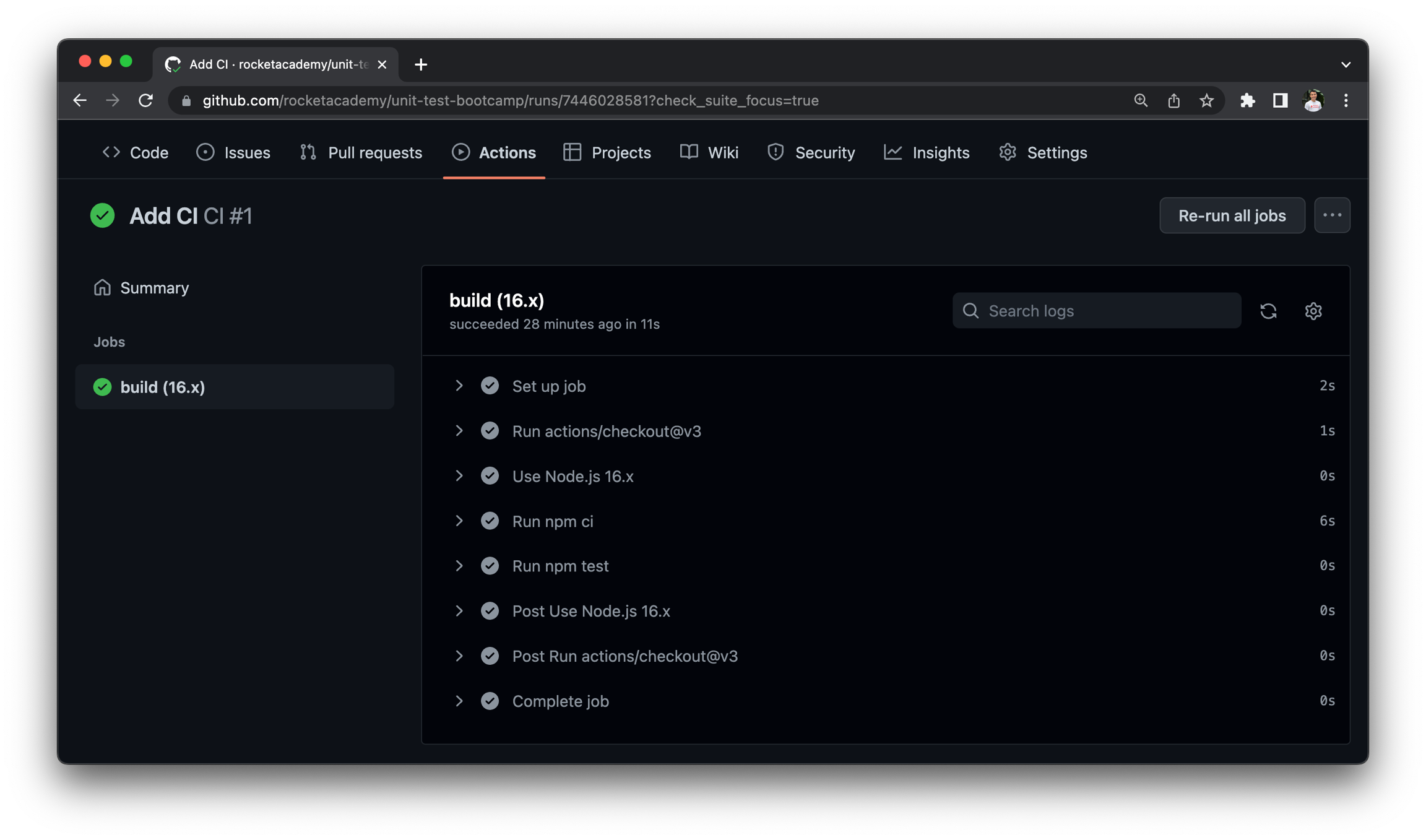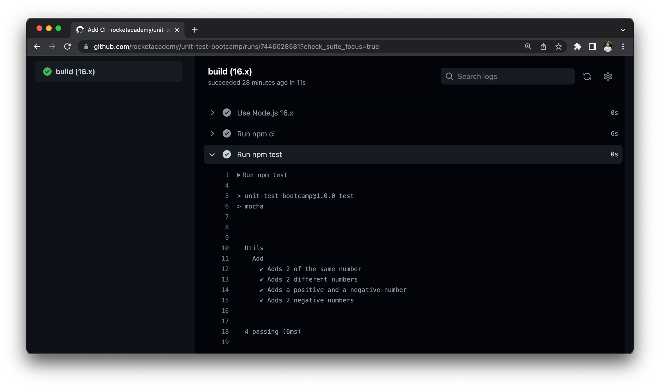 Rocket has created a simple CI workflow using the unit-test-bootcamp repo we introduced in the Testing submodule, copied below. Rocket's GitHub Actions workflow is modelled after the GitHub Actions Node.js starter workflow template.
