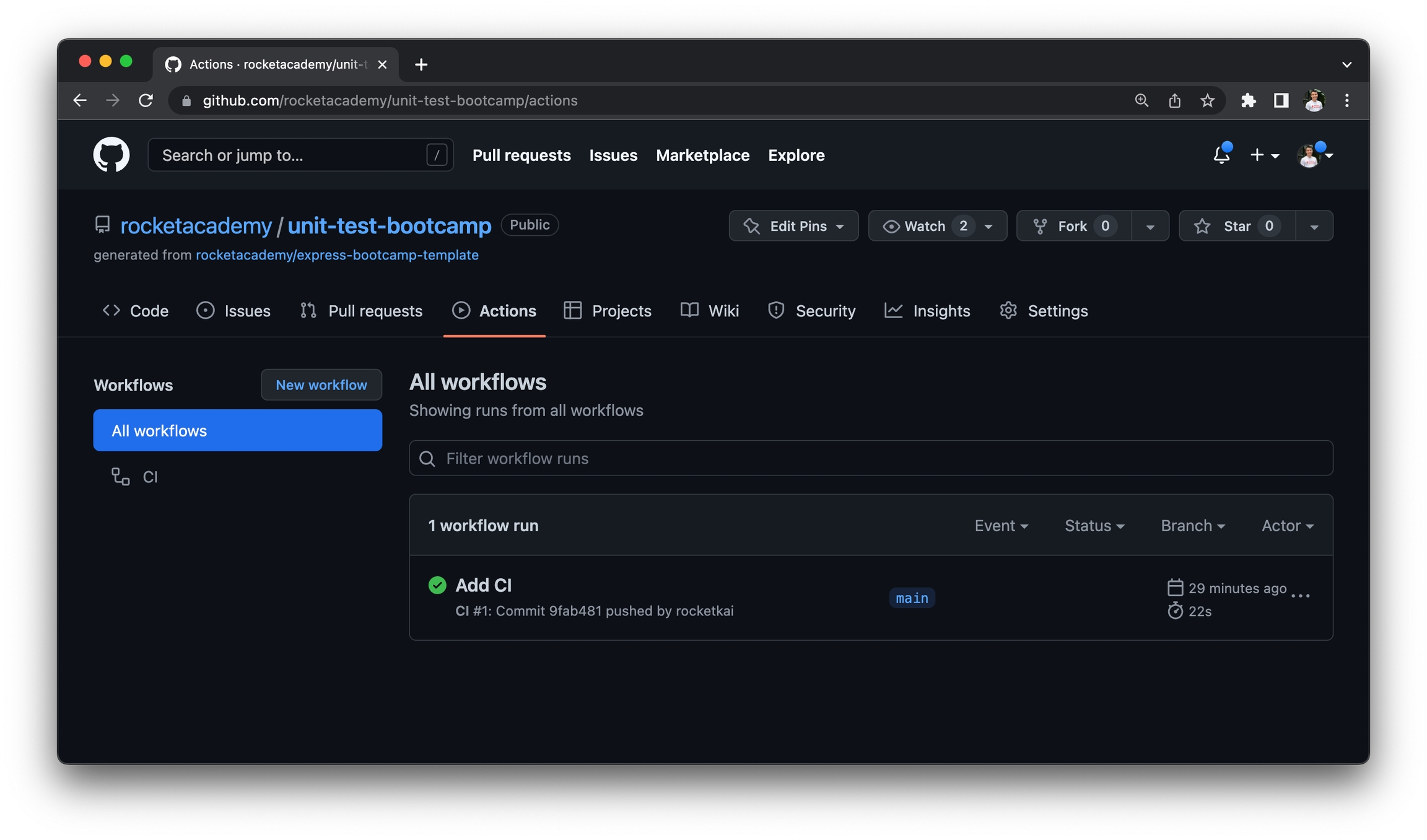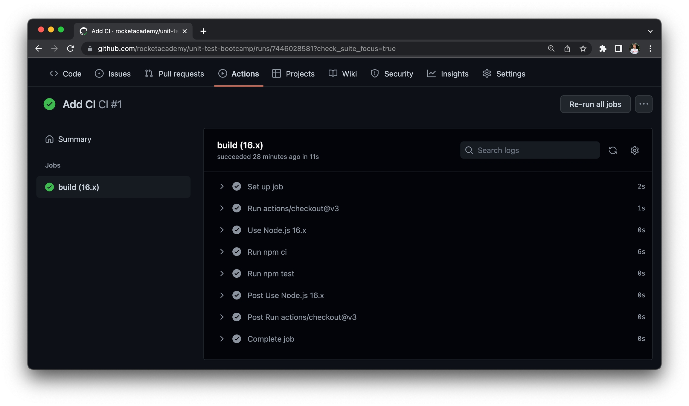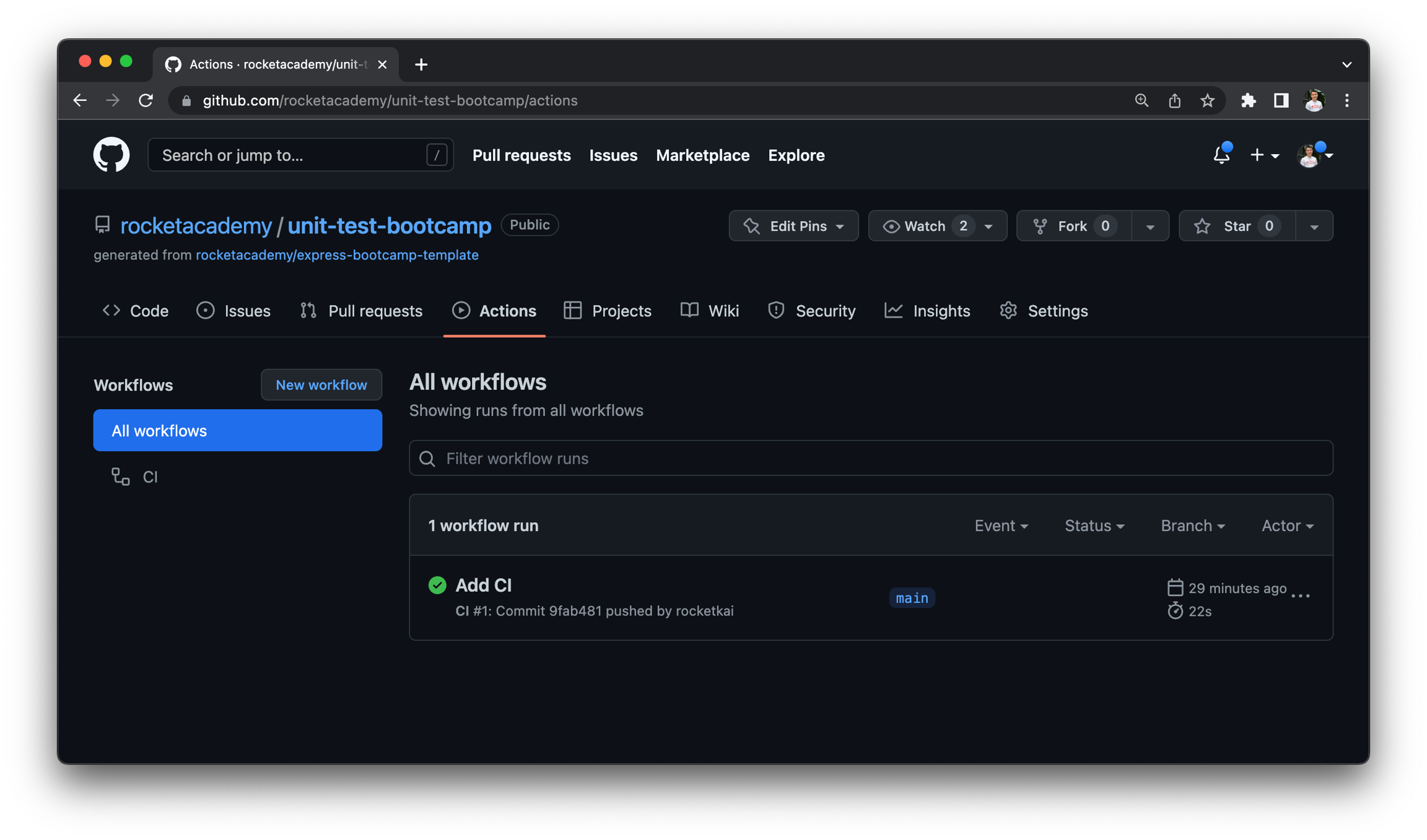 Rocket has created a simple CI workflow using the unit-test-bootcamp repo we introduced in the Testing submodule, copied below. Rocket's GitHub Actions workflow is modelled after the GitHub Actions Node.js starter workflow template.