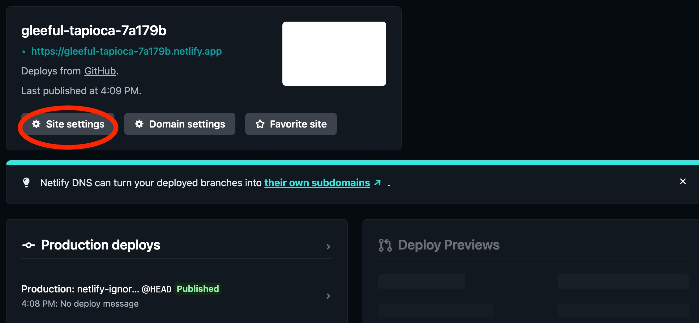 At this point your application is probably erroring this is because you need to set up the Environmental variables that are in our application. To do this goto your Netlify application dashboard, select Site settings: