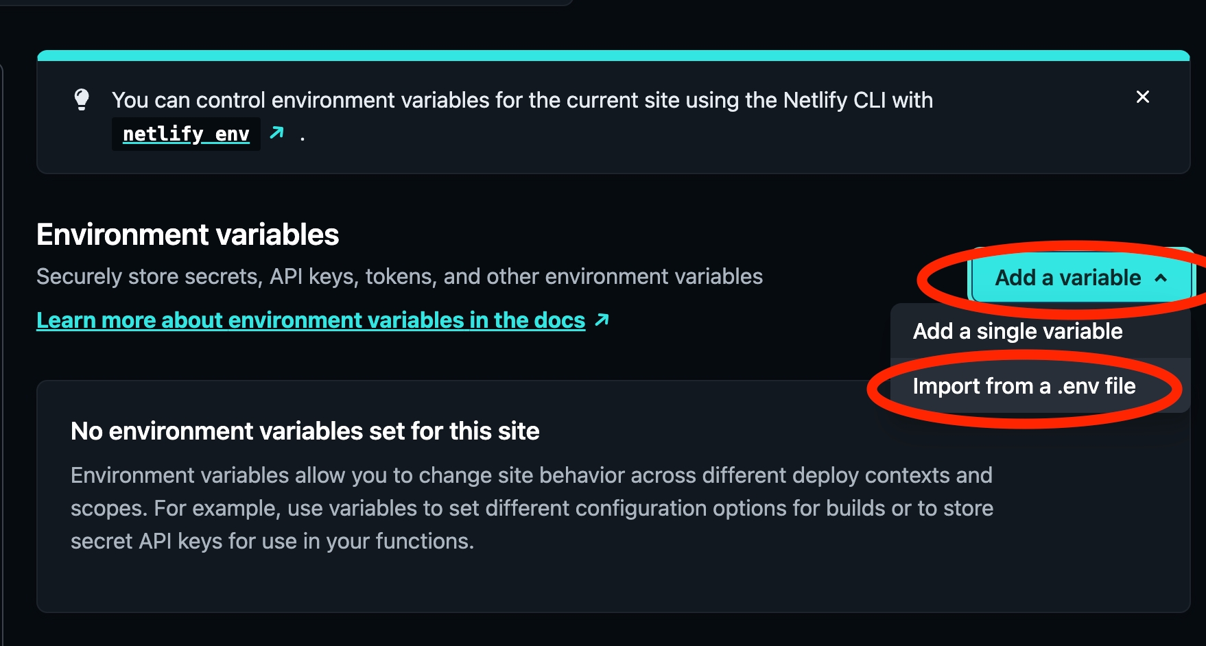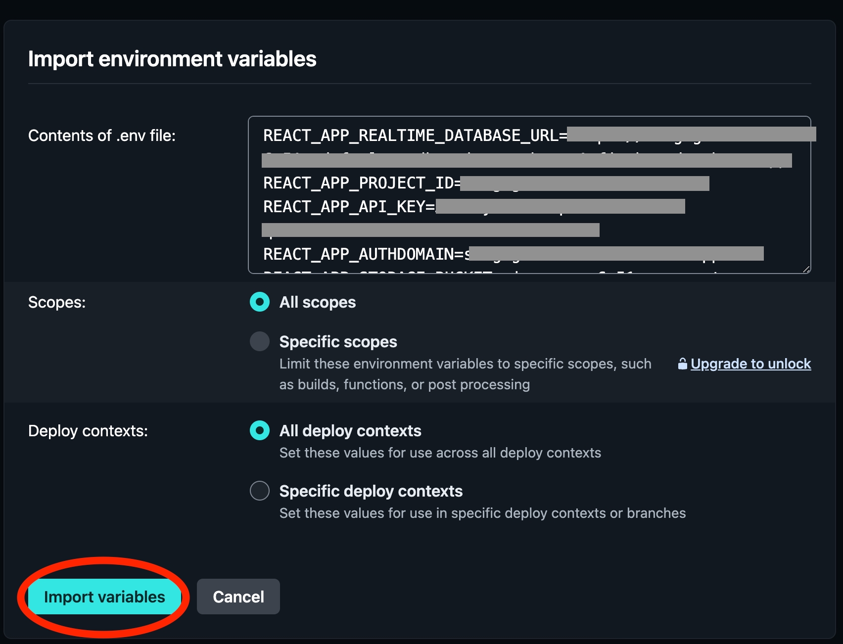 At this point copy the .env that you created to test out the React App. Once you've placed in all of your enviromental variables click on Import variables.