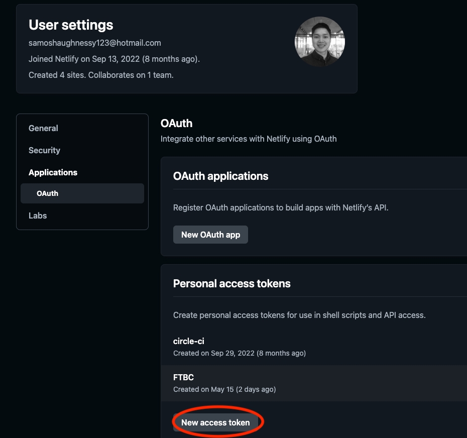 From here click on the Applications tab, navigate to the Personal access tokens section and click on New access token. Make sure you save the access token as you wont be able to access it later.