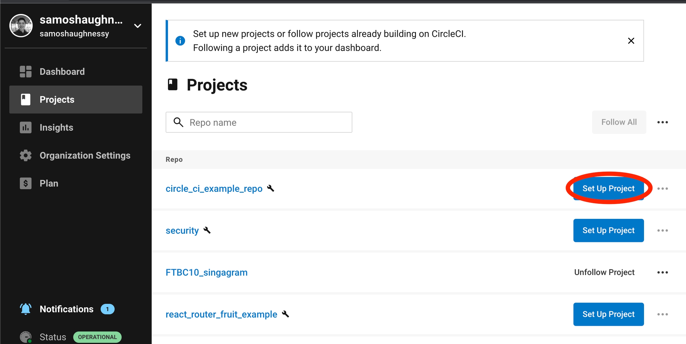 Next, navigate to the CircleCI application online, if you've not created an account please do so now and link it to your GitHub repositories. Once this is complete, click on the Projects tab, we are then able to see a list of all connected repo that we can deploy using Netlify. Choose the repo you wish to deploy and click Set Up Project: