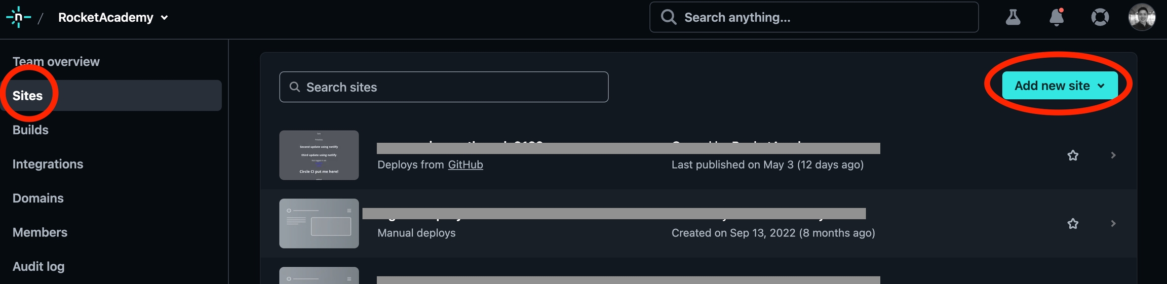 To deploy an application on Netlify you must goto the Netlify App online and login, click into the Sites tab and click on Add new site:
