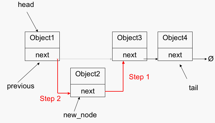 Point the "next" pointer in the new node to the node ahead of it in the list