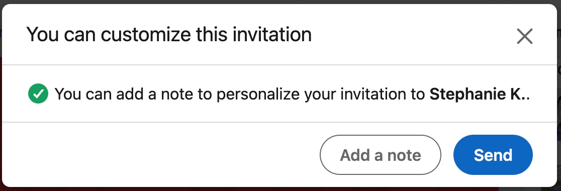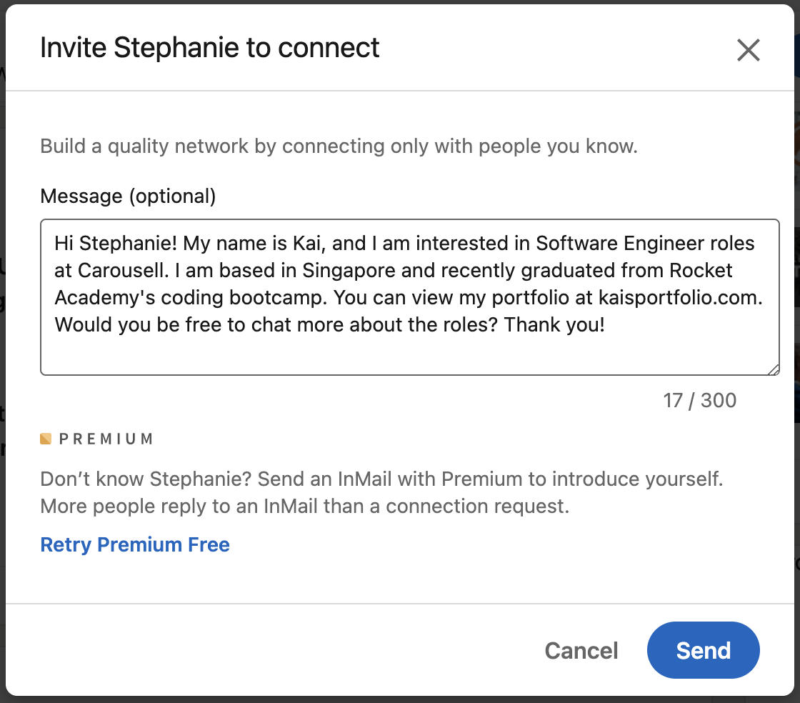 Feel free to connect with recruiters or engineers on LinkedIn that work for the companies you are interested in. This is what Rocket does behind the scenes. When connecting with them, always leave a note with a personal message. This greatly increases the chances they will respond to you.