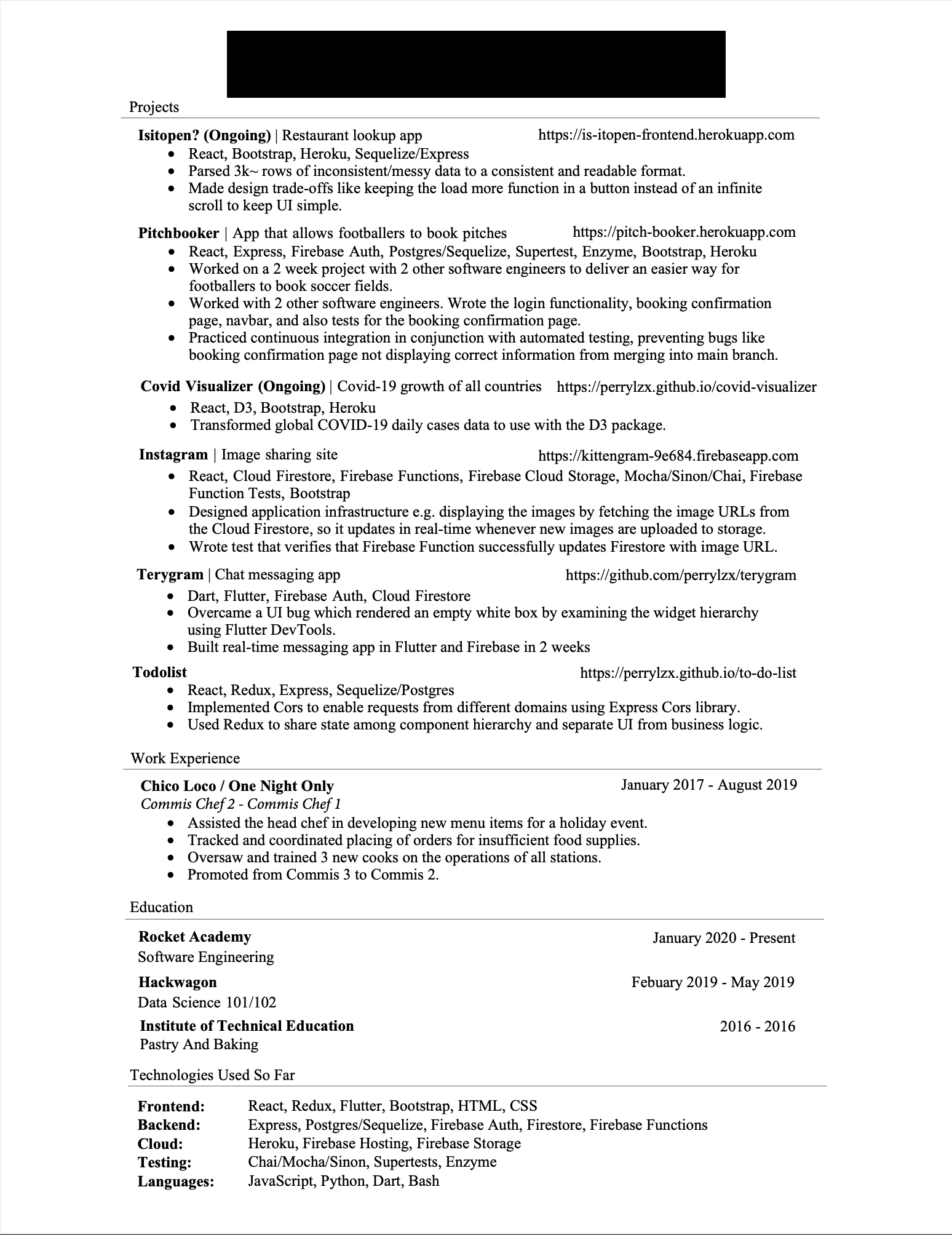 Bootcamp grads with minimal prior coding experience communicate Point #1 via projects. The first half of your resume should articulate your most impressive projects in decreasing order of impressiveness. This should be more than a list of technologies, because anyone can list technologies. Strive to express what you personally did for each project and how you accomplished it with the given technologies.